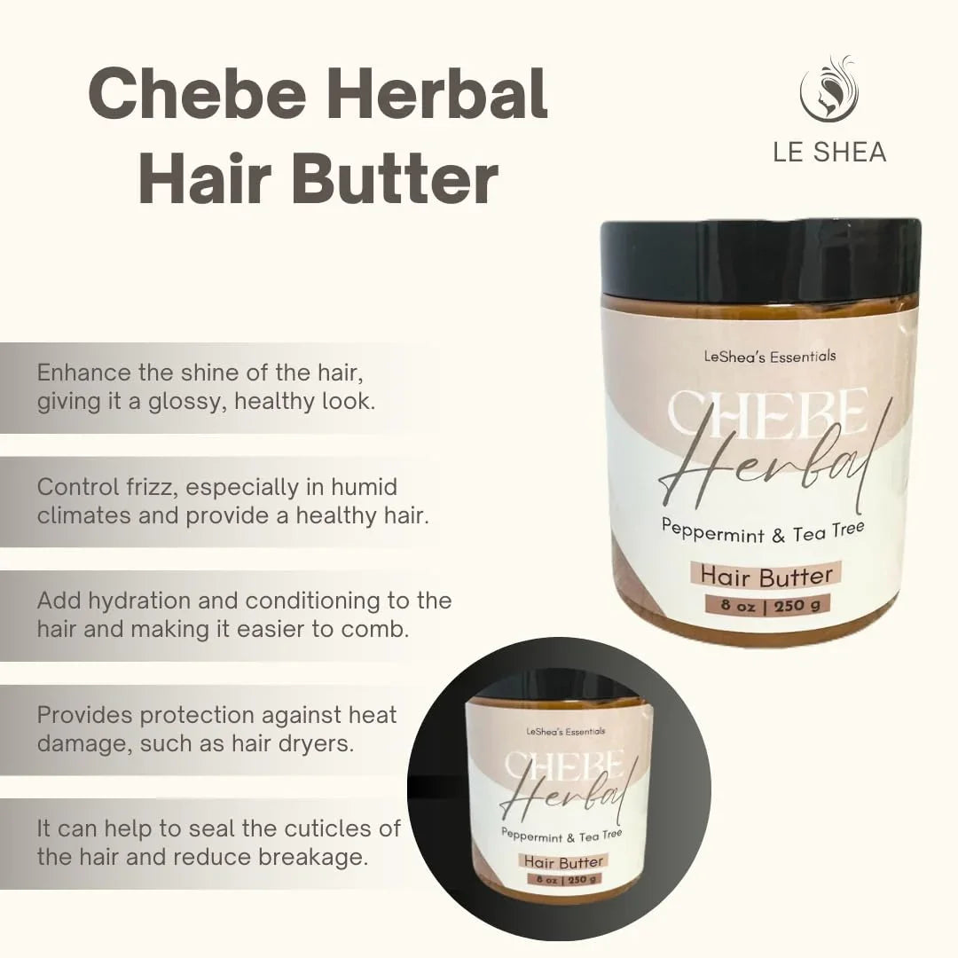 Giới thiệu Chebe Hair Butter, một sự kết hợp đột phá của 100% thành phần thuần chay và tự nhiên được thiết kế để thay đổi thói quen chăm sóc tóc của bạn. Được bổ sung sức mạnh nuôi dưỡng từ bơ xoài, bơ hạt mỡ và dầu thầu dầu đen hữu cơ Jamaica, loại kem sang trọng này dưỡng ẩm sâu và tăng cường sức khỏe cho mái tóc của bạn.